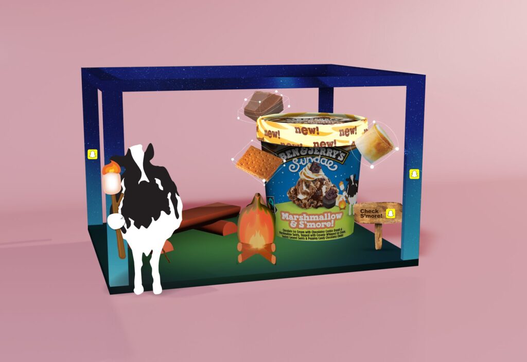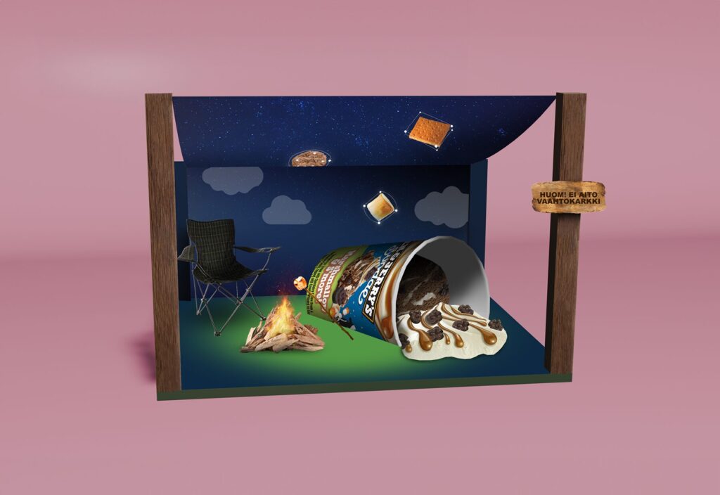 Suunnittelimme Ben & Jerry’sille Helsingin Rautatieasemalle Marshmallow & S’more Sundae maun kampanjapisteen ensiksi 3D-mallintamalla kampanja-alue. Kampanjaa varten tehtiin useampi eri asettelumalli 3D mallintamalla ennen kuin viimeinen asettelu löytyi.