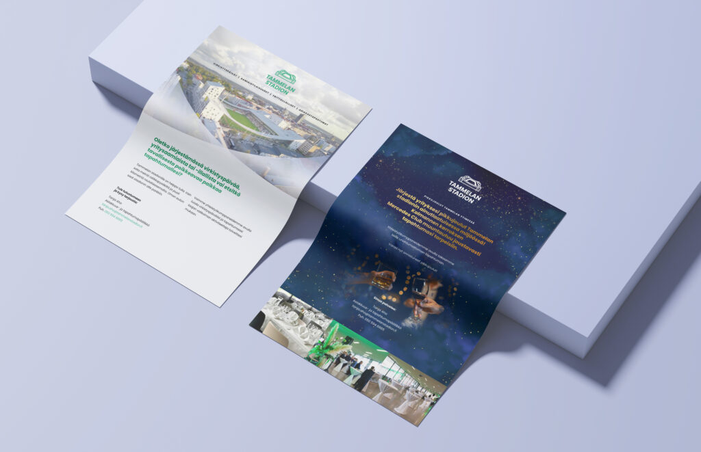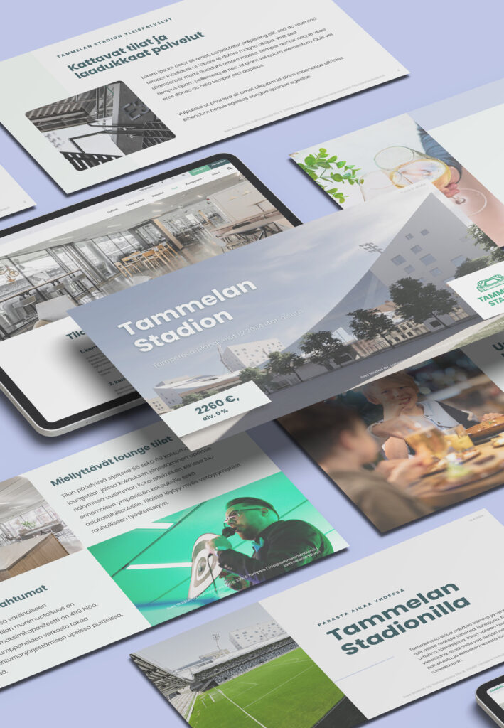Läheisessä yhteistyössä stadionia hallinnoivan Ilves Stadion Oy:n kanssa suunnittelimme stadionille verkkosivuston visuaalisine ilmeineen, sisältöineen ja lippukauppaintegraatioineen. Paikan päällä Tammelassa olemme toteuttaneet tilabrändäystä, ja stadionin myyntitiimin tueksi suunnittelimme näyttävät myyntiesitteet.